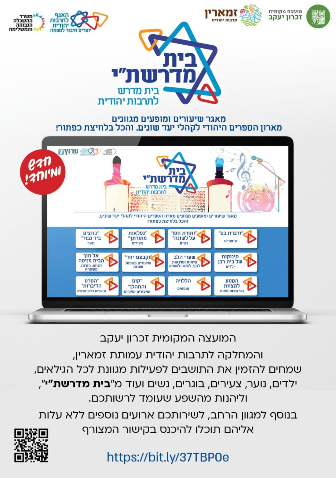 תושבים יקרים. מחלקת תרבות יהודית זכרון יעקב עושה מאמצים רבים על מנת להקל עליכם את הסגר, ולנצל את הזמן בצורה הטובה ביותר. פתחנו למענכם את האתר בית מדרשת"י עם מאות תכנים לכל המשפחה ולכל הגילאים , סרטים הצגות שיעורים משחקים וחידונים מוזמנים להיכנס לאתר להנות משלל הפעילויות האתר פתוח עבור תושבי זכרון יעקב, ולחברי תרבות … המשך קריאת הפוסט בית מדרשת"י