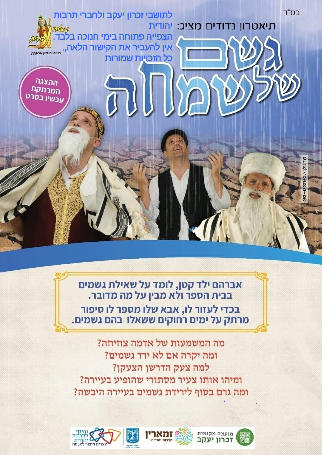 תושבי זכרון יעקב וחברי המחלקה לתרבות יהודית בנר שני של חנוכה לפני 138שנה עלו להר מתיישבי זכרון יעקב הראשונים אנו שמחים לציין אתכם את יום הקמה של זכרון יעקב. מזל טוב ליום ההולדת של זכרון יעקב אנו שמחים להגיש לכם הצגות לילדים כמיטב המסורת בחנוכה ומצרפים לכם את הקישור להצגה "גשם של שמחה" מבית תיאטרון … המשך קריאת הפוסט "גשם של שמחה" מבית תיאטרון נדודים
