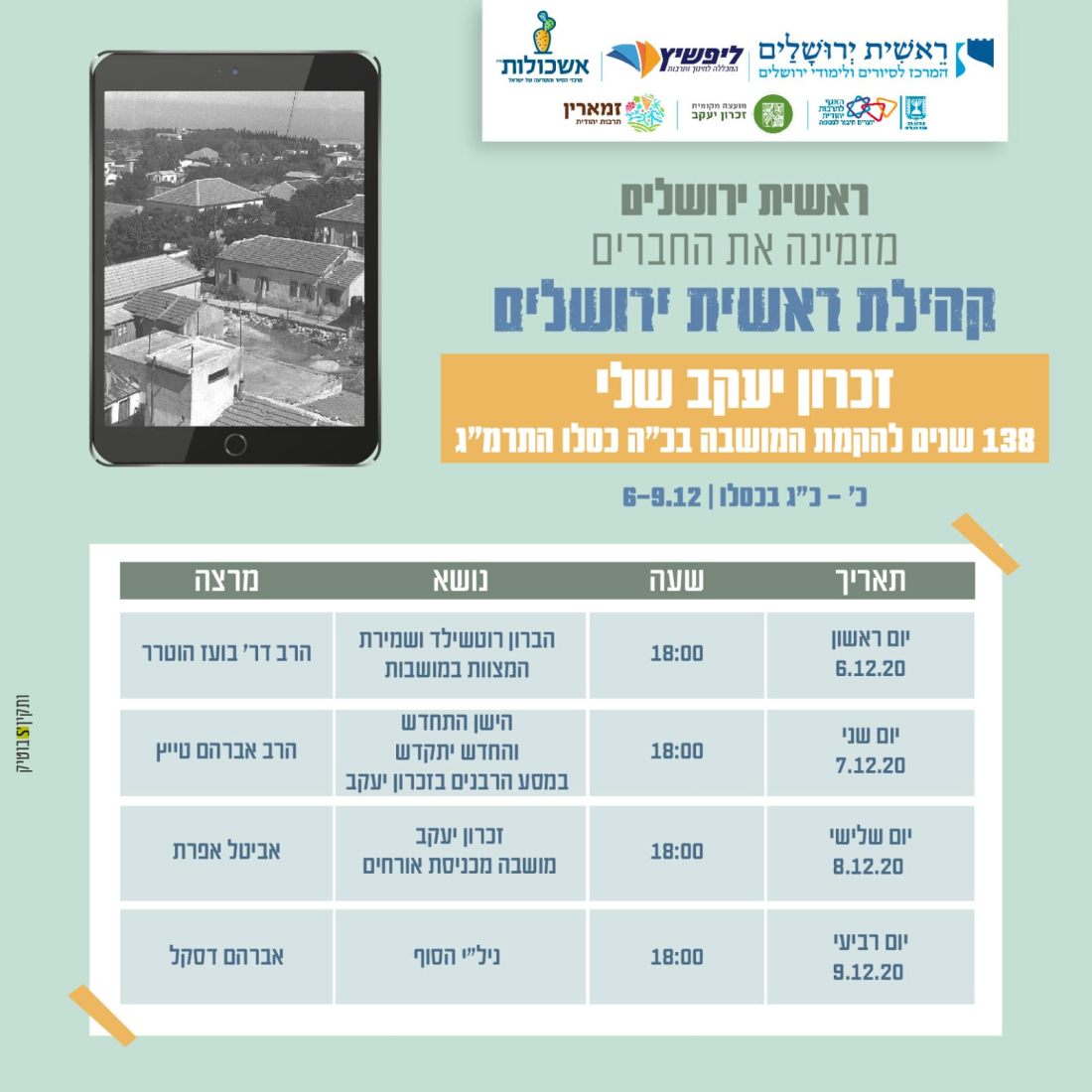 זכרון יעקב שלי – 138 שנים להקמת המושבה שהוקמה בנר שני של חנוכה מדרשת ראשית ירושלים האגף לתרבות יהודית מזמינים אתכם לסדרת הרצאות עם מיטב המרצים בין התאריכים 6-9/12 הקישורים ישלחו בקבוצת וואטסאפ https://chat.whatsapp.com/0RxCN4PLkSuCXeCocFwa7l מוזמנים להצטרף אלינובברכה ניר קובי