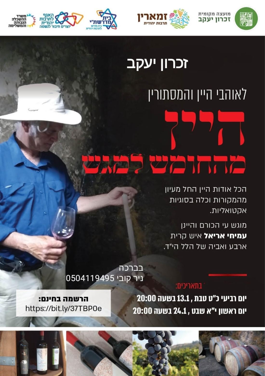 תושבי זכרון יעקב והסביבה מוזמנים להרצאתZOOM לאוהבי היין והמסתורין היין מהחומש למגש הכל אודות היין החל מהמקורות וכלה בסוגיות אקטואליות מוגש ע"י הכורם עמיחי אריאל (אביה של הלל אריאל הי"ד) יום רביעי 13.1.21 20:00 יום ראשון 24.1.21 20:00 קישור להרצאה ישלח בקבוצת המידע השקטה של תרבות יהודית זכרון יעקב https://chat.whatsapp.com/FbheXSizvL1EffVlKJM2xG בברכה ניר קובי 050-4119495