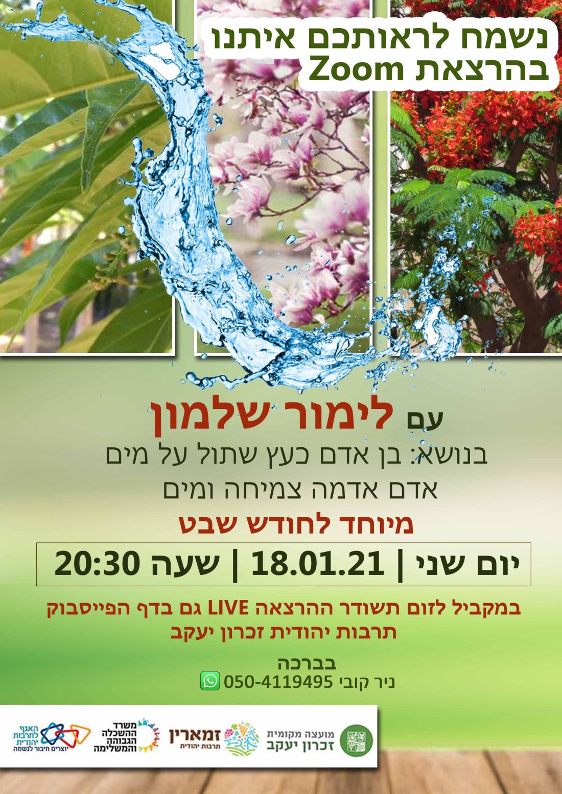 תושבי זכרון יעקב והסביבה מוזמנים להרצאת ZOOM בן אדם כעץ שתול על פלגי מים אדם אדמה צמחיה ומים – מיוחד לחודש שבט עם לימור שלמון יום שני 18.01.21 שעה 20:30 ההרצאה תשודר גם בלייב בדף הפייסבוק שלנו https://goo.gl/Hv7KSZ קישור להתחברות ל- ZOOM https://us02web.zoom.us/j/84436241814 בברכה ניר קובי 050-4119495