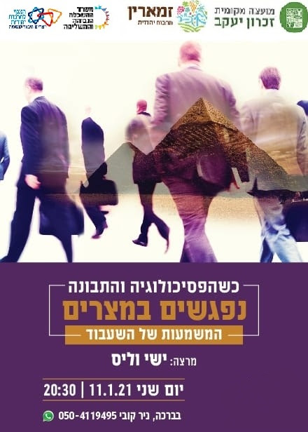 כשפסיכולוגיה והתבונה נפגשים במצרים הרצאת ZOOM מרתקת עם ישי וליס יום שני 11/11/21 בשעה 20:30 קישור לזום - https://us02web.zoom.us/j/83226776268?pwd=cVVnbTBuKzQ4NnpVWE1ScGZmeEhlQT09 בברכה, ניר קובי 050-4119495