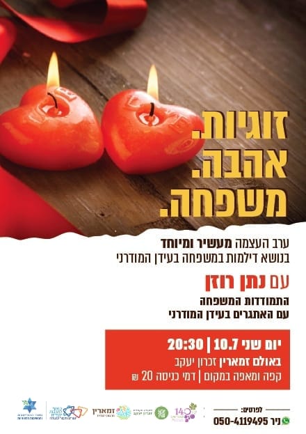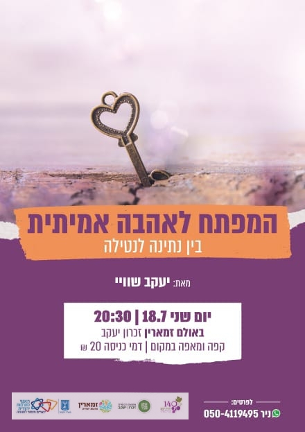 בין נתינה לנטילה – המפתח לאהבה אמיתית עם שווי יעקב יום שני 18.7.22 שעה 20:30 האירוע יתקיים באולם זמארין זכרון יעקב כניסה 20 ₪ ניר קובי 050-4119495