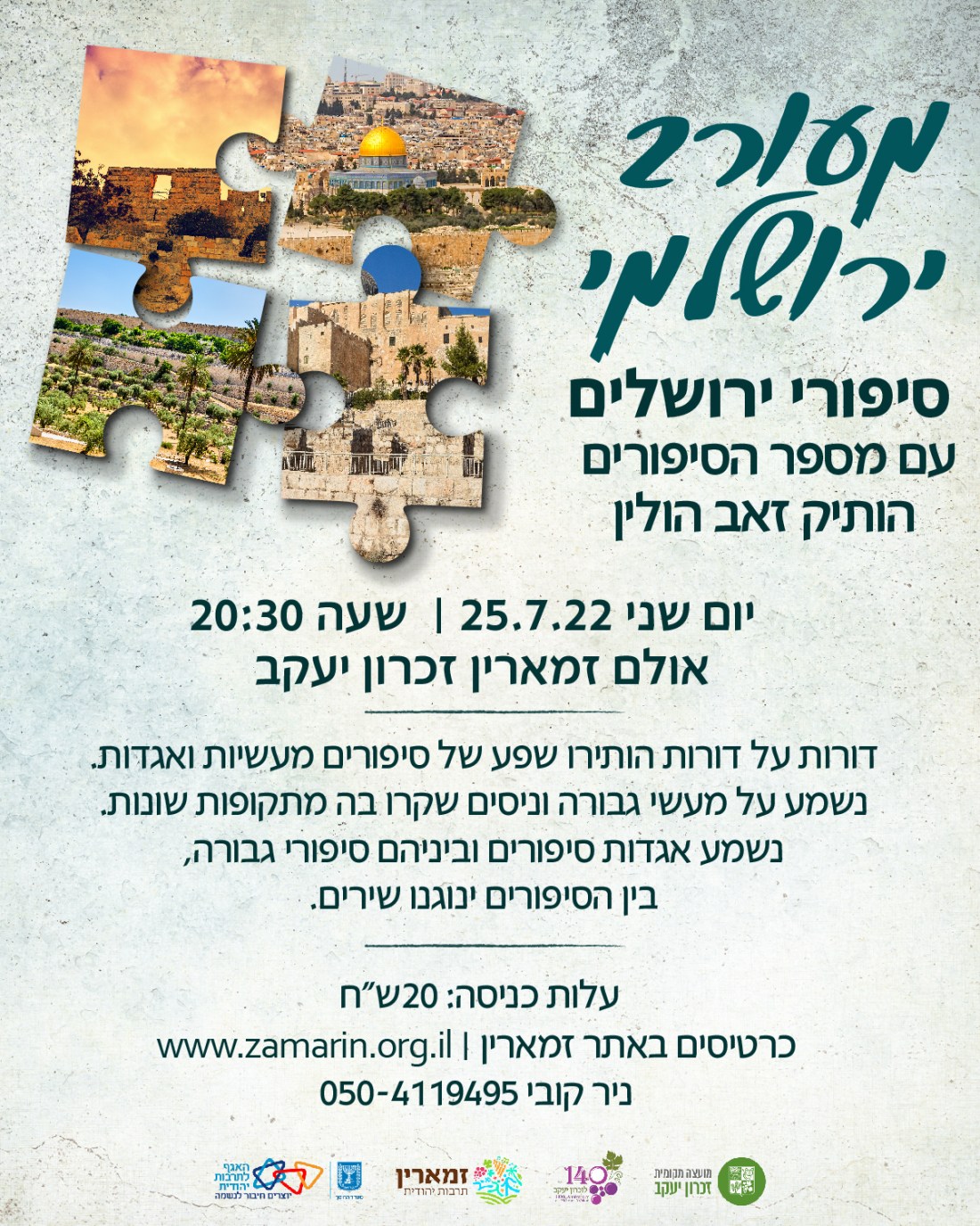 מעורב ירושלמי - סיפורי ירושלים דורות על דורות הותירו שפע של סיפורים מעשיות ואגדות. נשמע על מעשי גבורה וניסים שקרו בה מתקופות שונות. נשמע אגדות סיפורים וביניהם סיפורי גבורה, בין הסיפורים ינוגנו שירים. עם מספר הסיפורים הותיק זאב הולין יום שני 25.7.22 שעה 20:30 האירוע יתקיים באולם זמארין זכרון יעקב קישור לרכישת כרטיסים … המשך קריאת הפוסט מעורב ירושלמי – סיפורי ירושלים