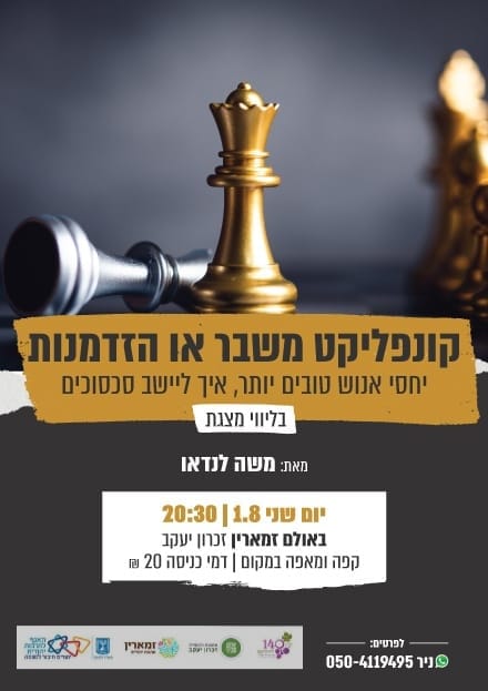 קונפליקט משבר או הזדמנות – יחסי אנוש טובים יותר, איך ליישב סכסוכים בליווי מצגת עם משה לנדאו יום שני 1.8.22 שעה 20:30 האירוע יתקיים באולם זמארין זכרון יעקב כניסה 20 ₪ ניר קובי 050-4119495