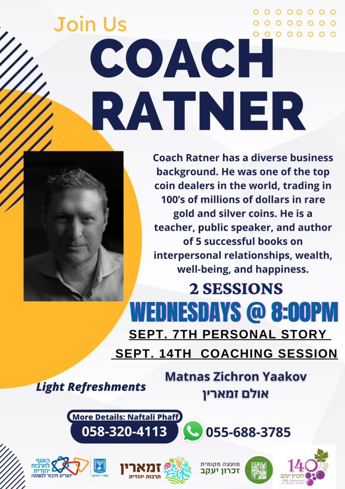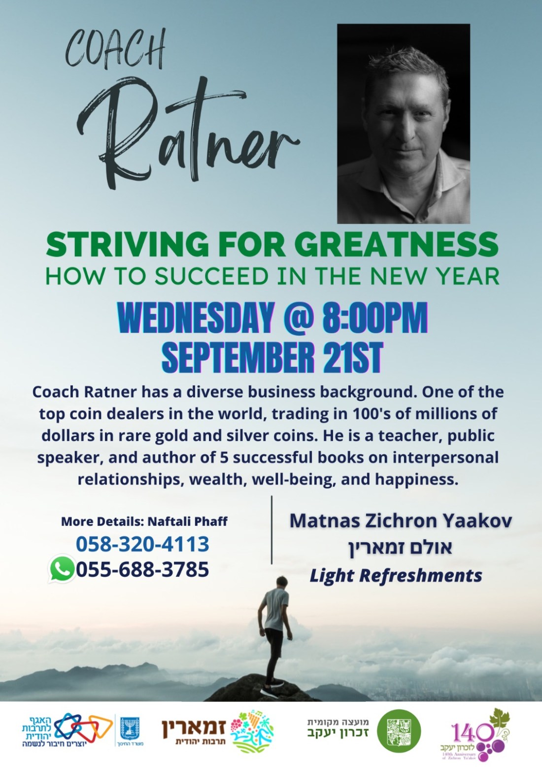 COACH Ratner STRIVING FOR GREATNESS HOW TO SUCCEED IN THE NEW YEAR WEDNESDAY @ 8:00PM SEPTEMBER 21ST Coach Ratner has a diverse business background. One of the top coin dealers in the world, trading in 100's of millions of dollars in rare gold and silver coins. He is a teacher, public speaker, and author of … המשך קריאת הפוסט COACH Ratner