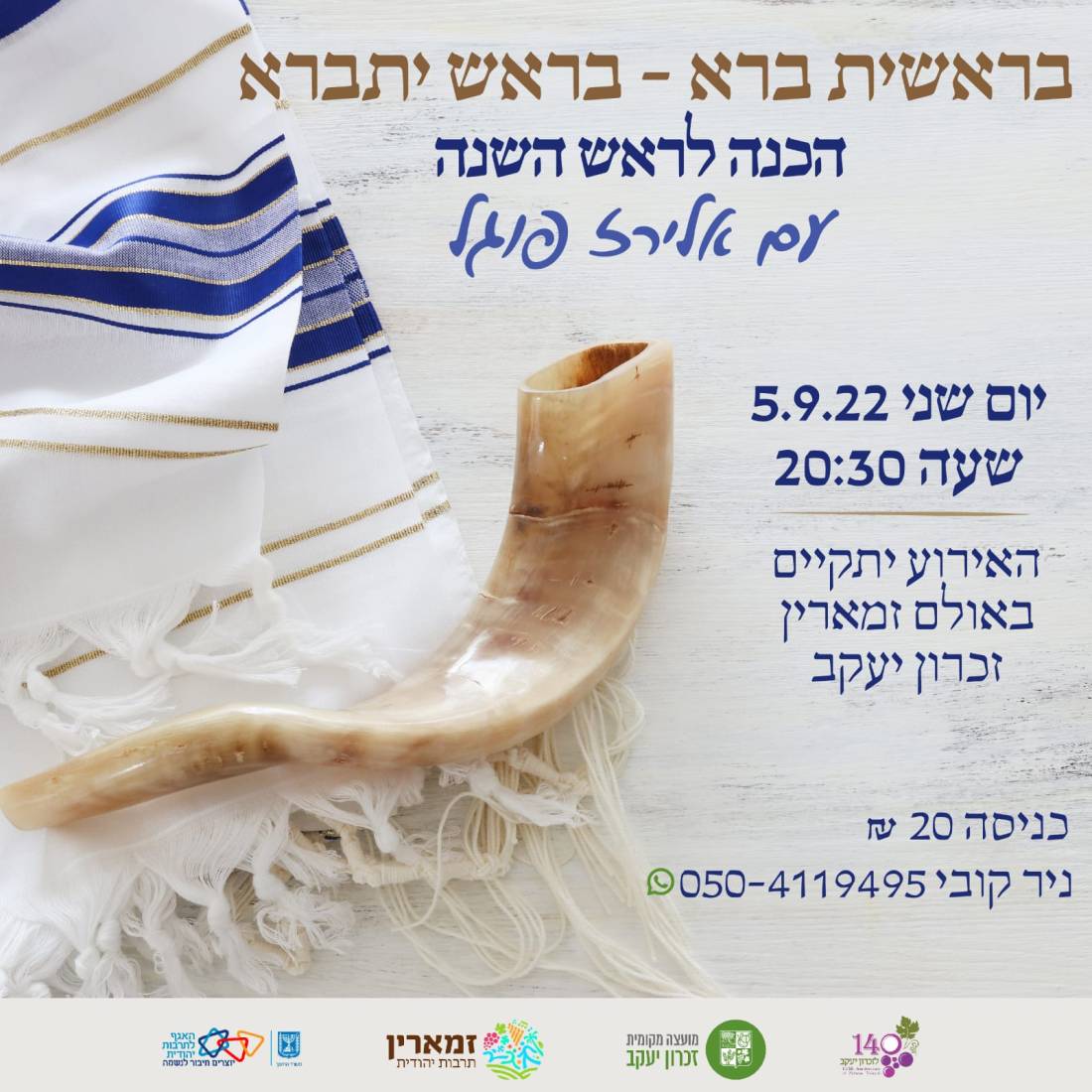 בראשית ברא – בראש יתבראהכנה לראש השנהעם הגב' אלירז פוגליום שני 5.9.22שעה 20:30האירוע יתקיים באולם זמארין זכרון יעקבכניסה 20 ₪ניר קובי 050-4119495