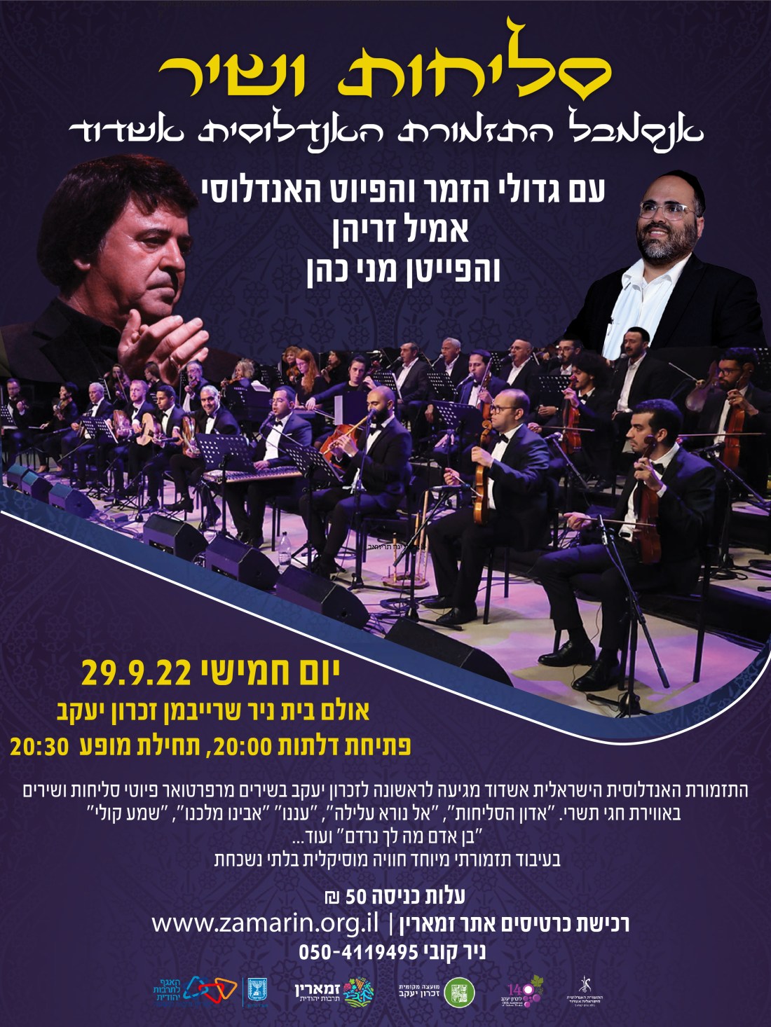 התזמורת האנדלוסית הישראלית אשדוד מגיעה לראשונה לזכרון יעקב עם גדול הזמר האנדלוסי אמיל זריהן והפייטן מני כהן ובהרכב 15 נגנים/יות לקונצרט "סליחות ושיר" בשירים מרפרטואר פיוטי סליחות ושירים ישראלים באווירת החגים. "אדון הסליחות", "אל נורא עלילה", "עננו" "אבינו מלכנו", "שמע קולי", "בן אדם מה לך נרדם" ועוד. כל השירים זכו לעיבוד תזמורתי מיוחד שיעניק לקהל … המשך קריאת הפוסט התזמורת האנדלוסית הישראלית אשדוד מגיעה לראשונה לזכרון יעקב