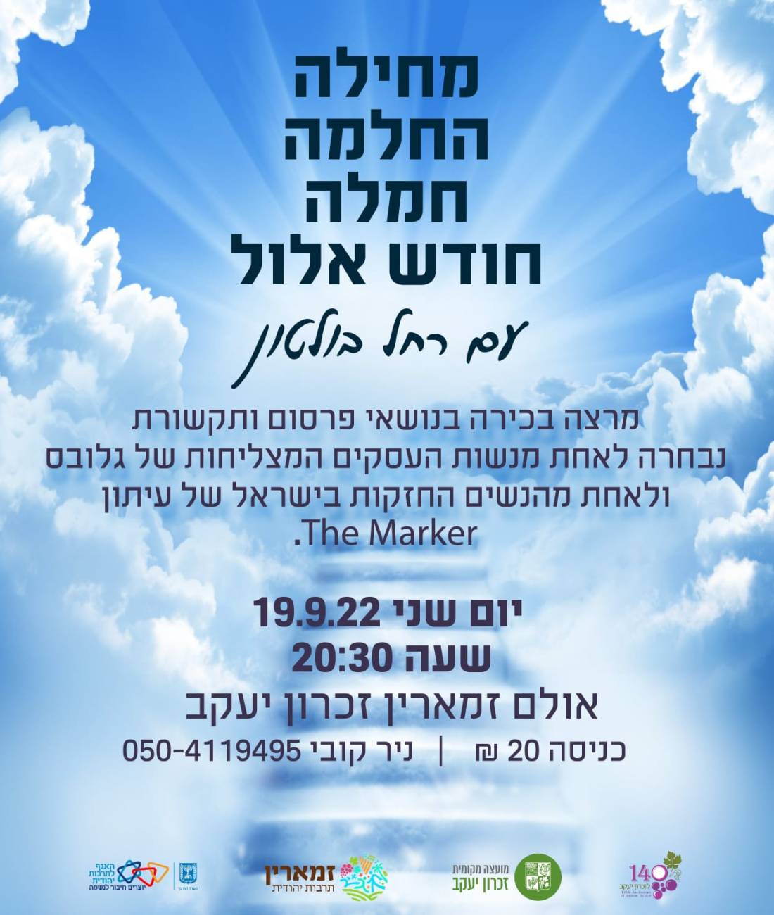 מחילה חמלה החלמה – חודש אלול עם רחל בולטון מרצה בכירה בנושאי פרסום ותקשורת נבחרה לאחת מנשות העסקים המצליחות של גלובס ולאחת מהנשים החזקות בישראל של עיתון The Marker. יום שני 19.9.22 שעה 20:30 האירוע יתקיים באולם זמארין זכרון יעקב כניסה 20 ₪ להרשמה באתר זמארין https://did.li/G9laa ניר קובי 050-4119495