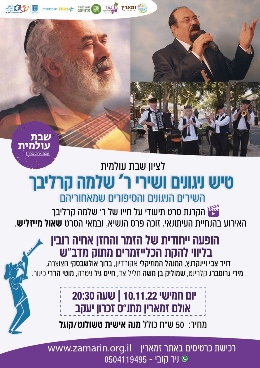 לציון שבת עולמית טיש ניגונים ומשירי קרליבך השירים הניגונים והסיפורים שמאחוריהם הקרנת סרט תיעודי על חייו של ר’ שלמה קרליבך האירוע בהנחיית העיתונאי, במאי הסרט, וזוכה פרס הנשיא שאול מייזליש. הופעה ייחודית של הזמר והחזן אחיה רובין בליווי להקת הכלייזמרים מתוק מדב"ש דויד צבי ויינקרנץ, המנהל המוזיקלי -אקורדיון. ברוך אולשבסקי- חצוצרה . מירי גרוסברג- קלרינט. … המשך קריאת הפוסט שבת עולמית – טיש ניגונים ושירי ר’ שלמה קרליבך