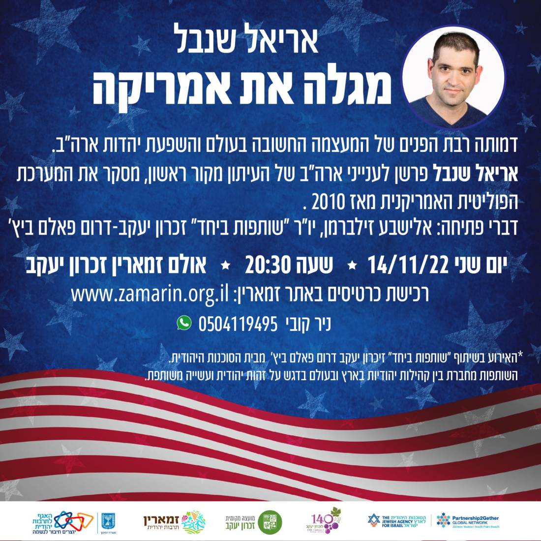 אריאל שנבל מגלה את אמריקה דמותה רבת הפנים של המעצמה החשובה בעולם והשפעת יהדות ארה"ב עם אריאל שנבל פרשן לענייני ארה”ב של העיתון מקור ראשון, מסקר את המערכת הפוליטית האמריקנית מאז 2010. דברי פתיחה: אלישבע זילברמן יו"ר "שותפות ביחד" זכרון יעקב דרום פאלם ביץ' יום שני 14/11/22 שעה 20:30 האירוע יתקיים באולם זמארין זכרון יעקב … המשך קריאת הפוסט אריאל שנבל מגלה את אמריקה
