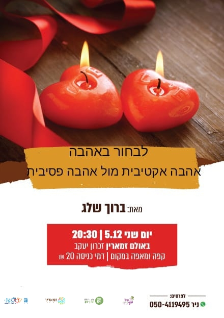 לבחור באהבה אהבה אקטיבית מול אהבה פסיבית עם ברוך ברק שלג יום שני 5.12.22 שעה 20:30 האירוע יתקיים באולם זמארין זכרון יעקב כניסה 20 ₪ ניר קובי 050-4119495