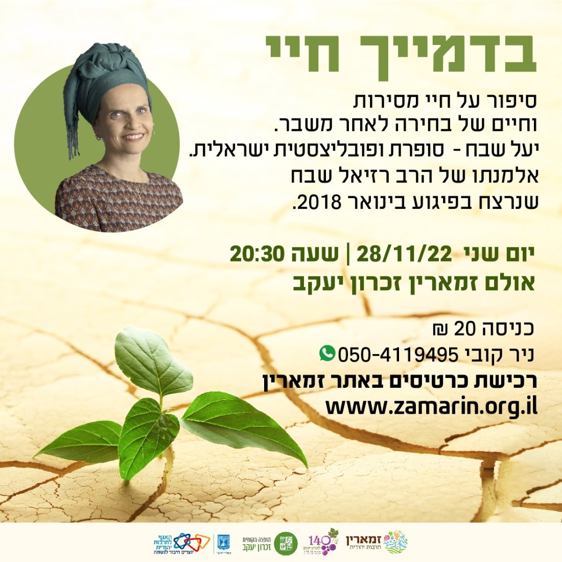 בדמייך חיי - סיפור על חיי מסירות וחיים של בחירה לאחר משבר. עם יעל שבח סופרת ופובליצסטית ישראלית אלמנתו של הרב רזיאל שבח שנרצח בפיגוע בינואר 2018 יום 28/11/22 שעה 20:30 האירוע יתקיים באולם זמארין זכרון יעקב כניסה 20 ₪ לרכישת כרטיסים באתר זמארין http://www.zamarin.org.il ניר קובי 050-4119495 ** תתקיים מכירת כרטיסים גם באירוע