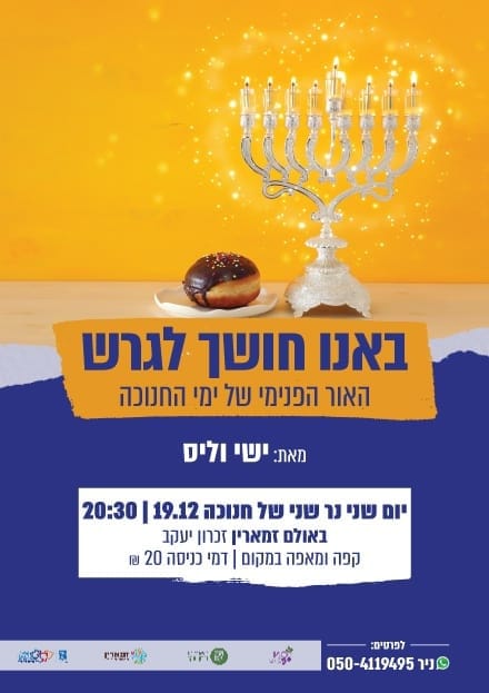 באנו חושך לגרש האור הפנימי של ימי החנוכה עם ישי וליס יום שני נר שני של חנוכה 19/12/22 שעה 20:30 האירוע יתקיים באולם זמארין זכרון יעקב לרכישת כרטיסים באתר זמארין https://did.li/5uK5q כניסה 20 ₪ ניר קובי 050-4119495