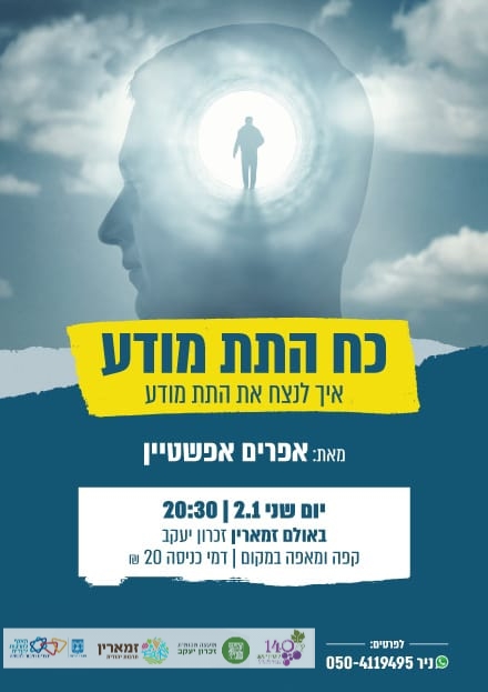 כח התת מודע איך לנצח את התת מודע עם אפרים אפשטיין יום שני 2/1/23 שעה 20:30 האירוע יתקיים באולם זמארין זכרון יעקב כניסה 20 ₪ ניר קובי 050-4119495