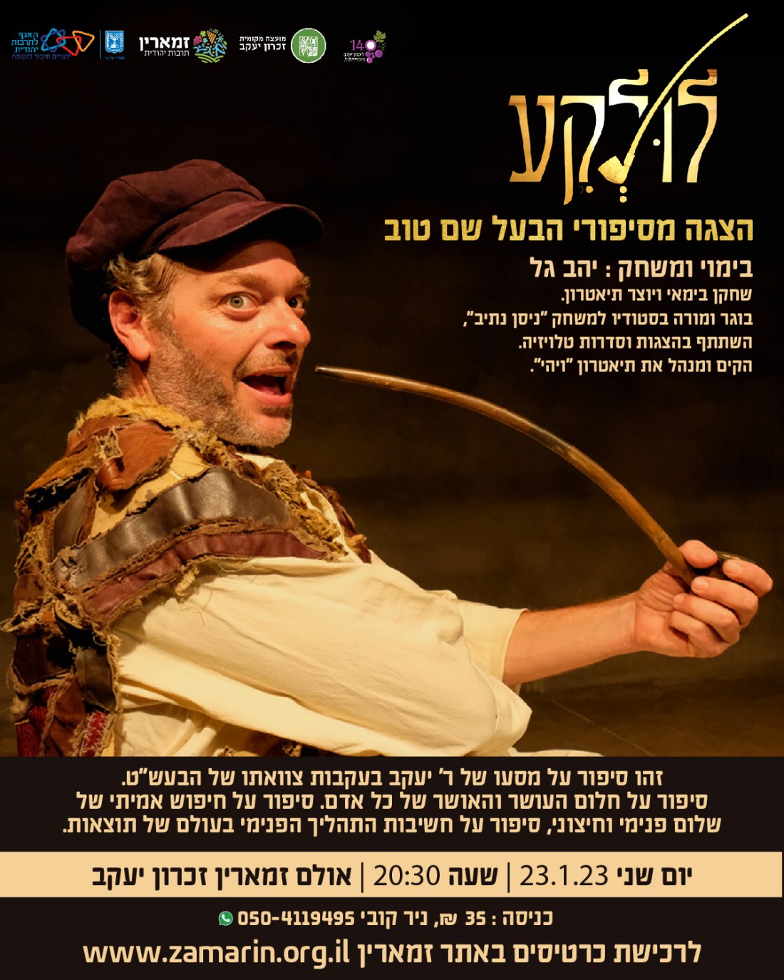 לולקע הצגה מסיפורי הבעל שם טוב זהו סיפור על מסעו של ר' יעקב בעקבות צוואתו של הבעש"ט. סיפור על חלום העושר והאושר של כל אדם. סיפור על חיפוש אמיתי של שלום פנימי וחיצוני, סיפור על חשיבות התהליך הפנימי בעולם של תוצאות. בימוי ומשחק : יהב גל שחקן בימאי ויוצר תיאטרון. בוגר הסטודיו למשחק "ניסן נתיב … המשך קריאת הפוסט לולקע – הצגה מסיפורי הבעל שם טוב
