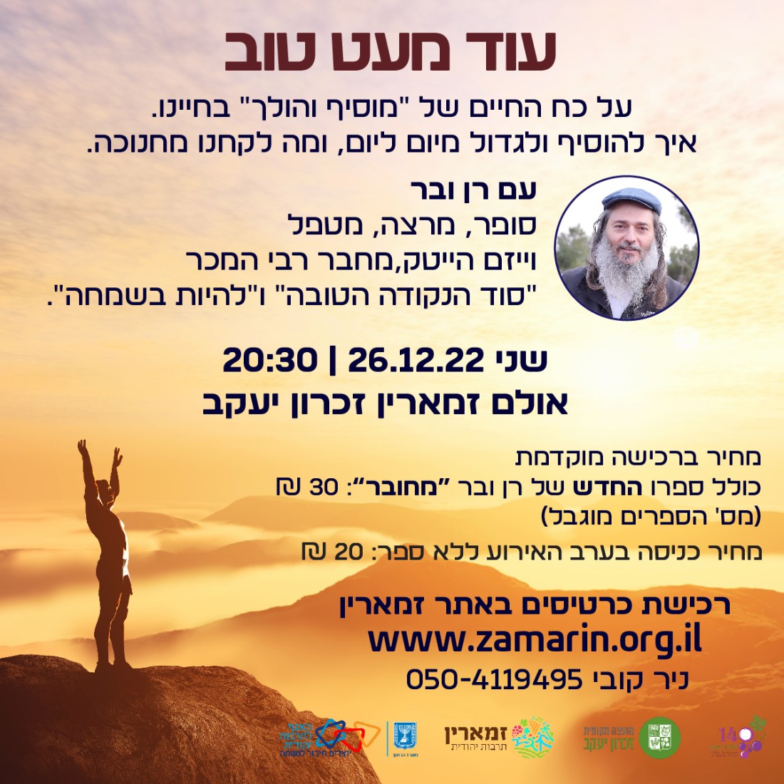 עוד מעט טוב על כח החיים של "מוסיף והולך" בחיינו. איך להוסיף ולגדול מיום ליום, ומה לקחנו מחנוכה. עם רן ובר, סופר, מרצה, מטפל וייזם הייטק, מחבר רבי המכר "סוד הנקודה הטובה" ו"להיות בשמחה" שני 26/12/22, שעה 20:30, אולם זמארין זכרון יעקב מחיר ברכישה מוקדמת כולל ספר של רן ובר: 30 ₪ (מס' הספרים מוגבל) … המשך קריאת הפוסט עוד מעט טוב – על כח החיים של "מוסיף והולך" בחיינו