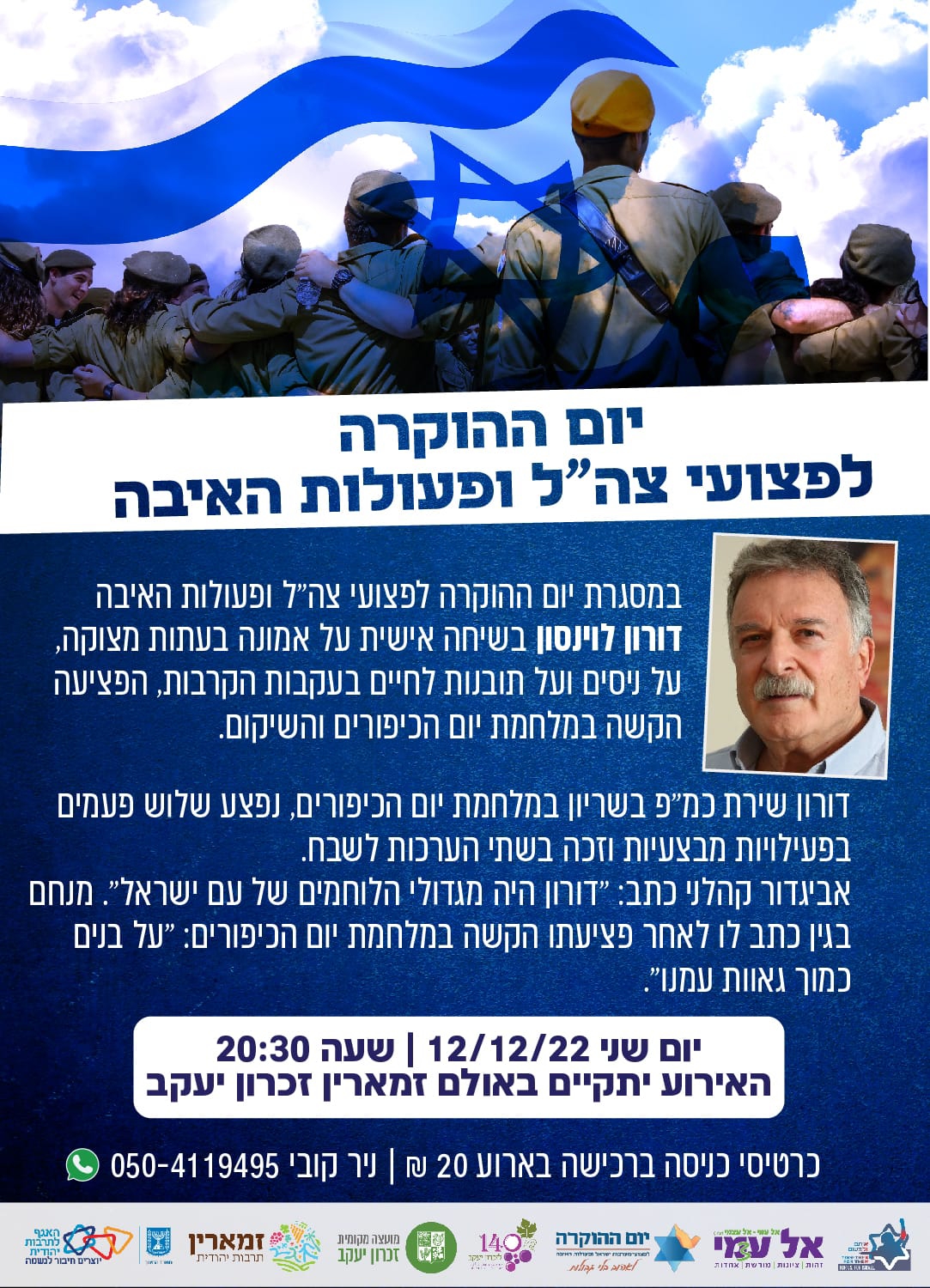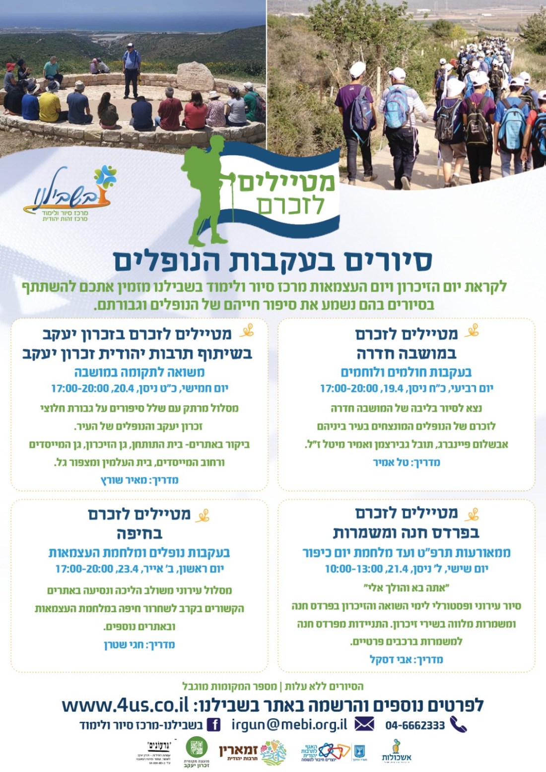 מטיילים לזכרם ארבעה סיורים ייחודיים בעקבות הנופלים- מס' המקומות מוגבל! מוזמנים להירשם ולהתחבר לימי הגבורה שבפתח, להנציח את אחינו הגיבורים ולהתייחד לזכרם. את הסיורים ידריכו מדריכים מקומיים המתמחים באזור. הסיורים ללא עלות, אך בהרשמה מראש. ונזכור את כולם קישור להרשמה https://4us.co.il/lezichram23/ מחלקת תרבות יהודית זכרון יעקב ומרכז סיור ולימוד בשבילנו