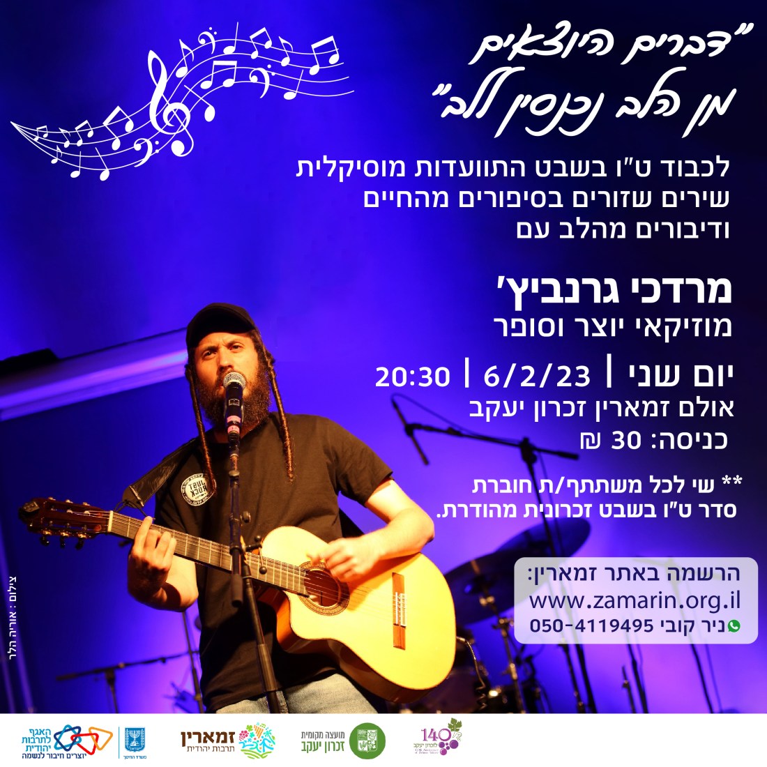 "דברים היוצאים מן הלב נכנסין ללב" (נועם אלימלך) לכבוד ט"ו בשבט התוועדות מוסיקלית שירים שזורים בסיפורים מהחיים ודיבורים מהלב עם מרדכי גרנביץ מוזיקאי יוצר וסופר יום שני 6/2/23 שעה 20:30 האירוע יתקיים באולם זמארין זכרון יעקב כניסה 30 ₪ לרכישת כרטיסים מוקדמת https://did.li/OLL5q ניר קובי 050-4119495 ** שי לכל משתתף/ת חוברת סדר ט"ו בשבט זכרונית … המשך קריאת הפוסט "דברים היוצאים מן הלב נכנסין ללב"