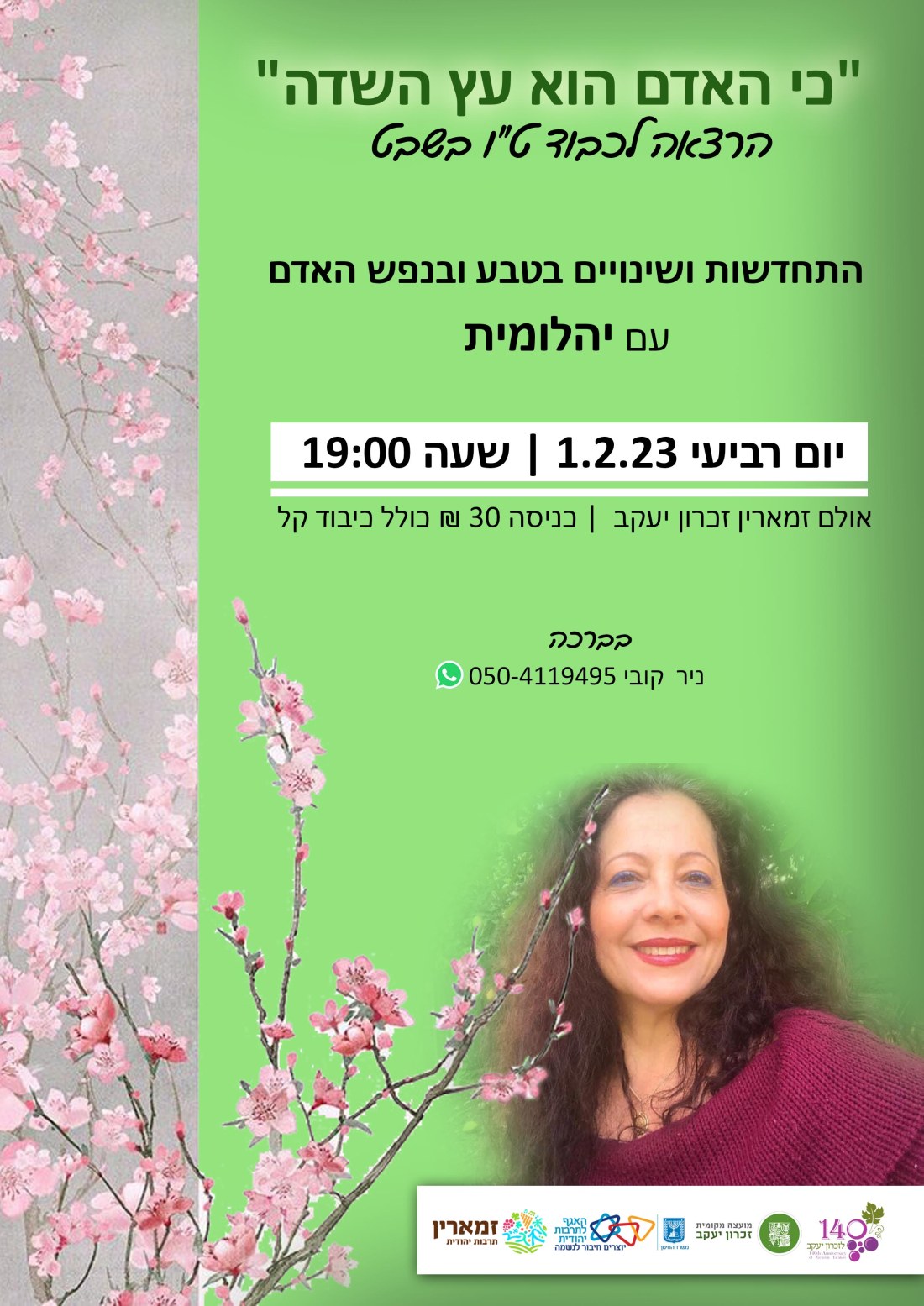 "כי האדם הוא עץ השדה " הרצאה לכבוד ט"ו בשבט התחדשות ושינויים בטבע ובנפש האדם עם יהלומית יום רביעי 1.2.23 שעה 19:00 אולם זמארין זכרון יעקב כניסה 30 ₪ כולל כיבוד קל בברכה ניר קובי 050-4119495