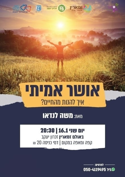 אושר אמיתי איך להנות החיים? עם משה לנדאו יום שני 16.1.23 שעה 20:30 האירוע יתקיים באולם זמארין זכרון יעקב כניסה 20 ₪ ניר קובי 050-4119495