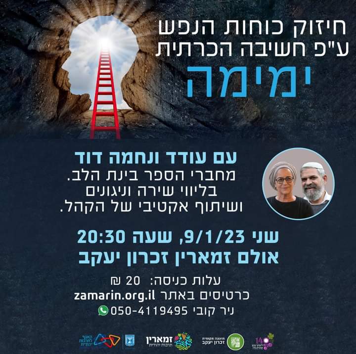 חיזוק כוחות הנפש ע"פ חשיבה הכרתית ימימה עם עודד ונחמה דוד. מחברי הספר בינת הלב. בליווי שירה וניגונים ושיתוף אקטיבי של הקהל. יום שני 9/1/23 שעה 20:30 האירוע יתקיים באולם זמארין זכרון יעקב לרכישת כרטיסים באתר זמארין https://did.li/Z8tTY כניסה 20 ₪ ניר קובי 050-4119495