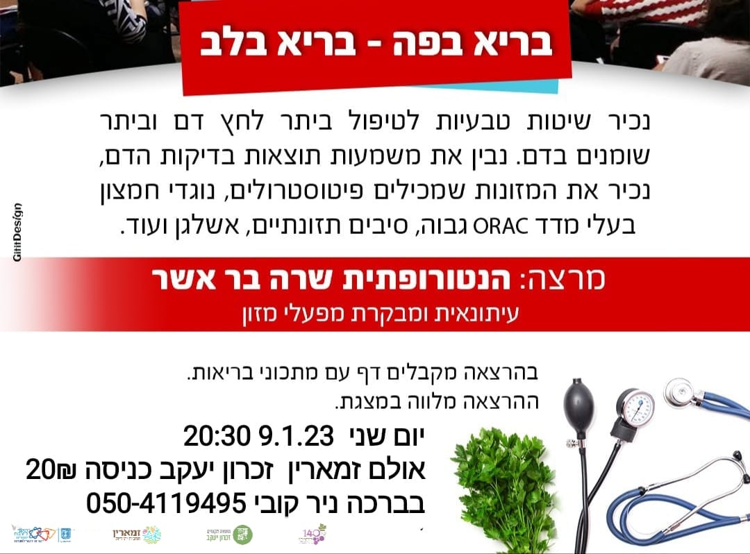 בריא בפה בריא בלב עם שרה בר אשר נטורופתית עיתונאית ומבקרת מפעלי מזון יום שני 9.1.23 שעה 20:30 האירוע יתקיים באולם זמארין זכרון יעקב כניסה 20 ₪ בברכה ניר קובי 0504119495