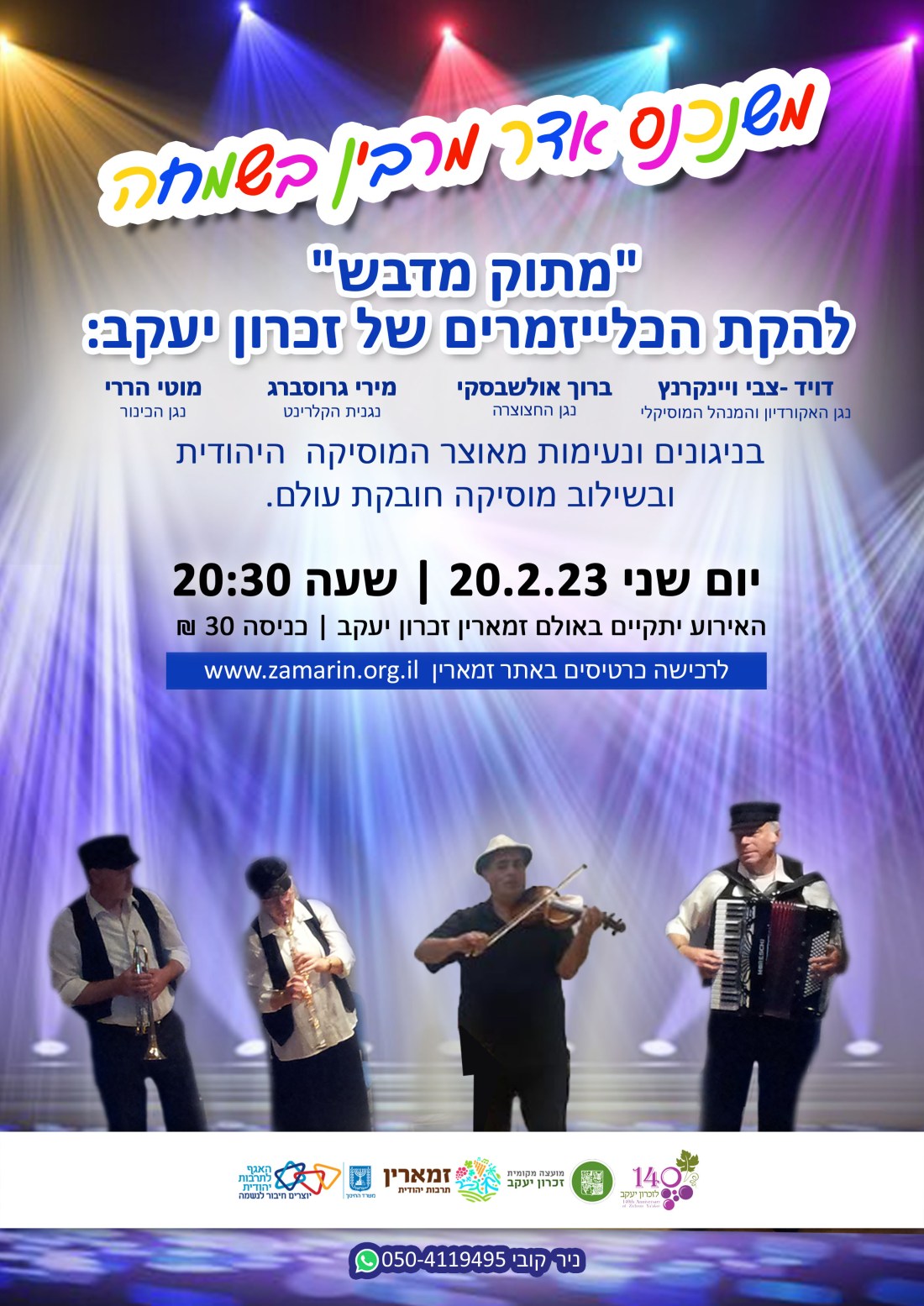 משנכנס אדר מרבין בשמחה לכבוד ראש חודש אדר "מתוק מדבש" להקת הכלייזמרים של זכרון יעקב דויד -צבי ויינקרנץ נגן האקורדיון והמנהל המוסיקלי, ברוך אולשבסקי נגן החצוצרה , מירי גרוסברג נגנית הקלרינט ומוטי הררי נגן הכינור . בניגונים ונעימות מאוצר המוסיקה היהודית ובשילוב מוסיקה חובקת עולם. יום שני 20.2.23 שעה 20:30 האירוע יתקיים באולם זמארין זכרון … המשך קריאת הפוסט משנכנס אדר מרבין בשמחה