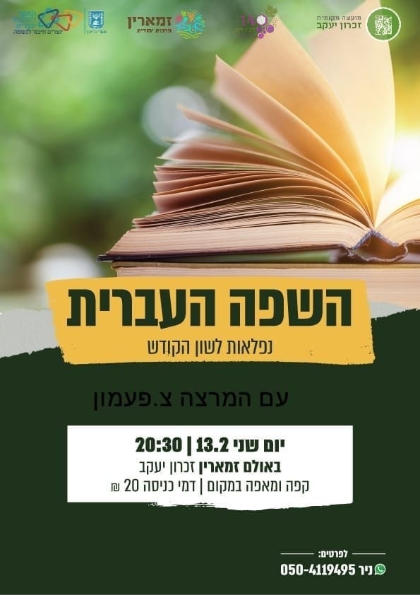 השפה העברית נפלאות לשון הקודש עם צ.פעמון יום שני 13.2.23 שעה 20:30 האירוע יתקיים באולם זמארין זכרון יעקב כניסה 20 ₪ ניר קובי 050-4119495