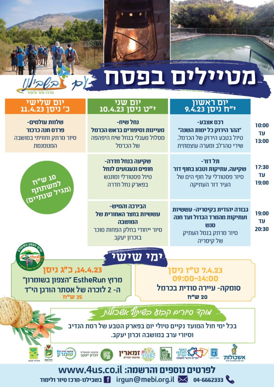 מטיילים בפסח עם בשבילנו מגוון סיורים לכל המשפחה. סיורי עששיות, שכשוך במעיינות, סיפורי מורשת, עתיקות ועוד. כמו כן מרוץ בצפון השומרון, כולל מקצה הליכה בטבע. הרבה אפשרויות ולכם נותר רק לבחור... מוזמנים להתרשם ולשריין מקום, לינק: https://4us.co.il/events-cat/passover/ מספר המקומות מוגבל בברכת פסח כשר ושמח ניר קובי וצוות בשבלינו