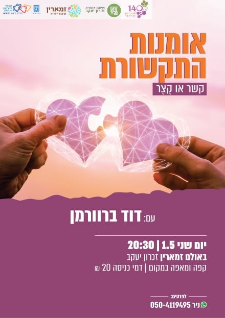 אומנות התקשורת קשר או קצר ( לנקד את המילה קצר בסגול בפלייר ) עם דוד ברוורמן יום שני 1.5.23 שעה 20:30 האירוע יתקיים באולם זמארין זכרון יעקב כניסה 20 ₪ ניר קובי 050-4119495