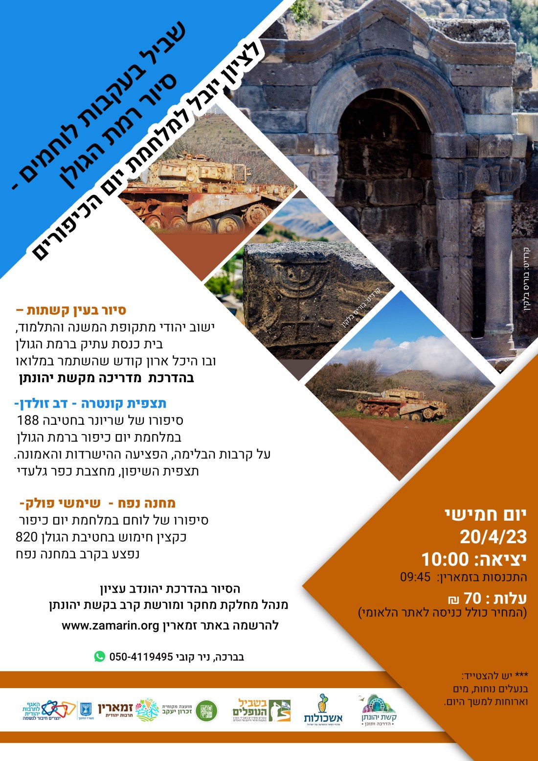 שביל בעקבות לוחמים - סיור ברמת הגולן לציון יובל למלחמת יום הכיפוריםסיור בעין קשתות –ישוב יהודי מתקופת המשנה והתלמוד, בית כנסת עתיק ברמת הגולן ובו היכל ארון קודש שהשתמר במלואו בהדרכת מדריכה מקשת יהונתן תצפית קונטרה- דב זולדן סיפורו של שריונר בחטיבה 188 במלחמת יום כיפור ברמת הגולן על קרבות הבלימה, הפציעה ההישרדות והאמונה. תצפית השיפון, מחצבת כפר גלעדי … המשך קריאת הפוסט שביל בעקבות לוחמים – סיור ברמת הגולן