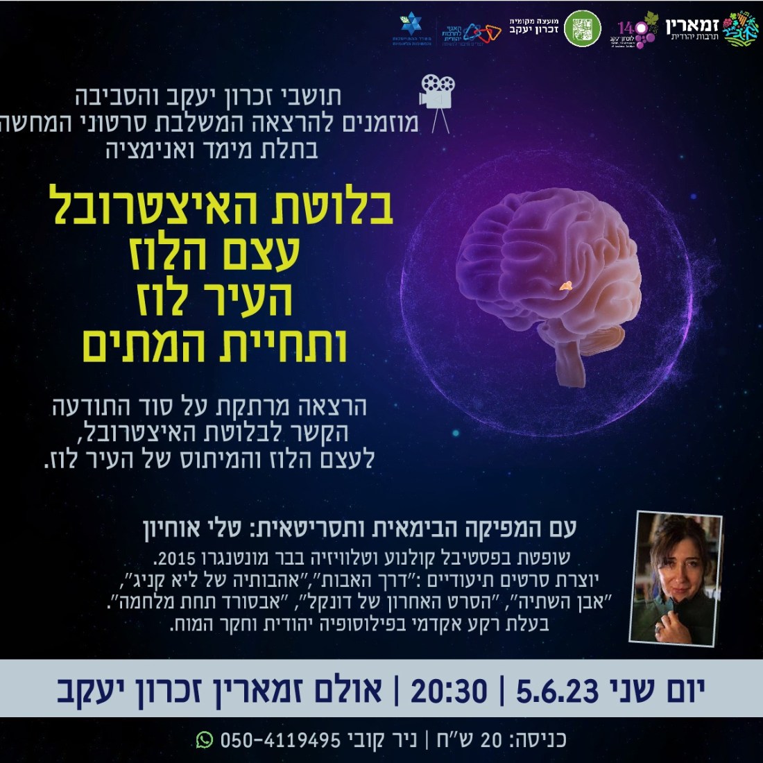 תושבי זכרון יעקב והסביבה מוזמנים להרצאה משולבת בהקרנת סרט בלוטת האיצטרובל עצם הלוז העיר לוז ותחיית המתים הרצאה מרתקת על סוד התודעה הקשר לבלוטת האיצטרובל, לעצם הלוז והמיתוס של העיר לוז. עם המפיקה הבימאית ותסריטאית טלי אוחיון שופטת בפסטיבל קולנוע וטלוויזיה בבר מונטנגרו 2015. יוצרת סרטים תיעודיים :"דרך האבות" "אהבותיה של ליא קניג,"אבן השתיה", "הסרט … המשך קריאת הפוסט בלוטת האיצטרובל עצם הלוז העיר לוז ותחיית המתים עם טלי אוחיון