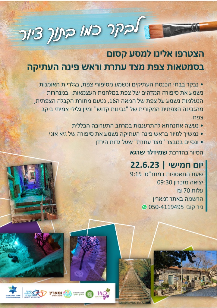 לבקר כמו בתוך ציור הצטרפו אלינו למסע קסום בסמטאות צפת מצד עתרת וראש פינה העתיקה נבקר בבתי הכנסת העתיקים ונשמע מסיפורי צפת. בגלריות האומנות נשמע את סיפורה המדהים של צפת במלחמת העצמאות. במנהרות הנעלמות נשמע על צפת של המאה ה16, נטעם מתורת הקבלה הצפתית, מהגבינה הצפתית המקורית של "גבינות קדוש" ומיין גלילי אמיתי ביקב צפת. … המשך קריאת הפוסט לבקר כמו בתוך ציור