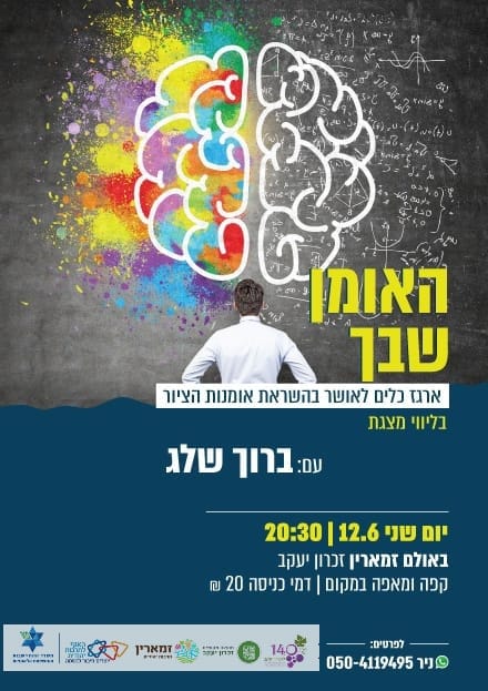 האומן שבך- ארגז כלים לאושר בהשראת אומנות הציור בליווי מצגת ציורים עם ברוך ברק שלג יום שני 12.6.23 שעה 20:30 האירוע יתקיים באולם זמארין זכרון יעקב כניסה 20 ₪ ניר קובי 050-4119495