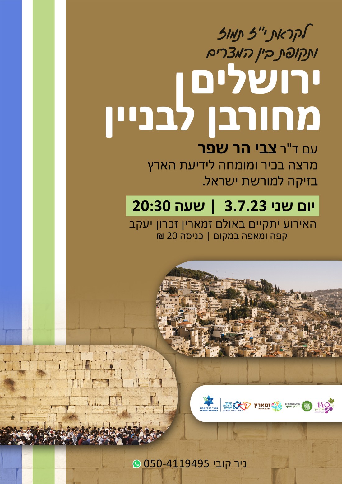 לקראת י''ז תמוז ותקופת בין המצרים ירושלים מחורבן לבניין עם ד"ר צבי הר שפר מרצה בכיר ומומחה לידיעת הארץ בזיקה למורשת ישראל. יום שני 3.7.23 שעה 20:30 כניסה 20 ₪ קפה ומאפה במקום האירוע יתקיים באולם זמארין זכרון יעקב ניר קובי 050-4119495