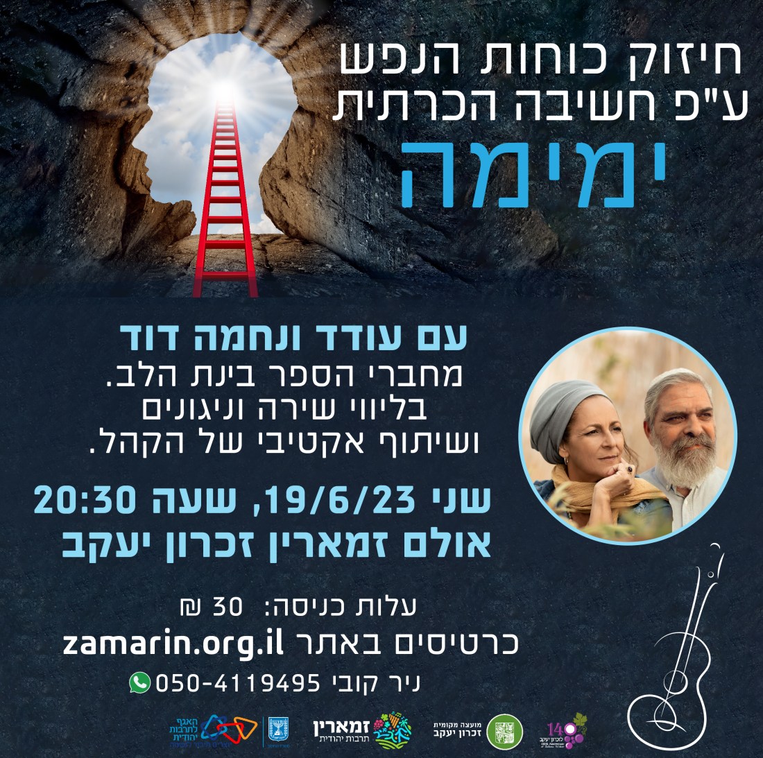 חיזוק כוחות הנפש ע"פ חשיבה הכרתית ימימה עם עודד ונחמה דוד. מחברי הספר בינת הלב. בליווי שירה וניגונים ושיתוף אקטיבי של הקהל. יום שני 19.6.23 שעה 20:30 האירוע יתקיים באולם זמארין זכרון יעקב לרכישת כרטיסים באתר זמארין https://did.li/dDvTY כניסה 30 ₪ ניר קובי 050-4119495