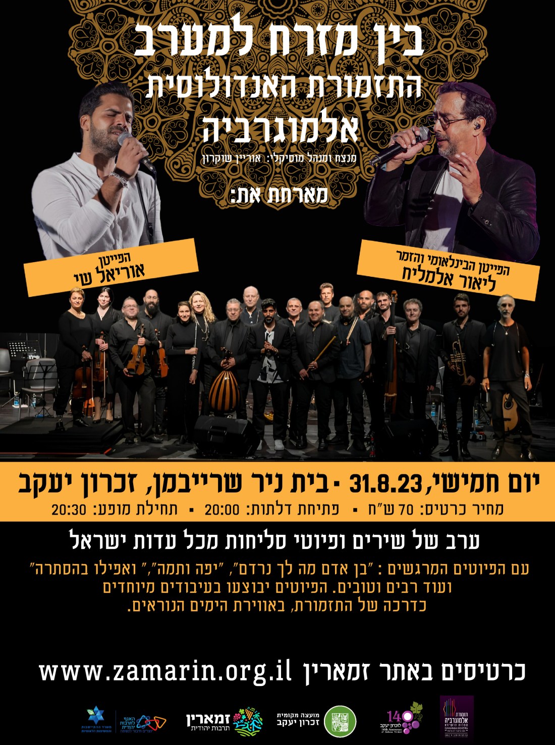 בין מזרח למערב - ערב פיוטים וניגונים לימים הנוראים. התזמורת האנדלוסית "אלמוגרביה" מגיעה לזכרון יעקב עם הפייטן הבינלאומי והזמר "ליאור אלמליח" והפייטן "אוריאל שי" לערב של שירים ופיוטי סליחות מכל העדות, עם הפיוטים המרגשים: "בן אדם מה לך נרדם", "יפה ותמה", "ואפילו בהסתרה", ועוד רבים וטובים, הפיוטים מנוגנים בעיבודים מיוחדים כדרכה של התזמורת, באווירת הימים … המשך קריאת הפוסט בין מזרח למערב – ערב פיוטים וניגונים לימים הנוראים עם התזמורת האנדלוסית "אלמוגרביה"