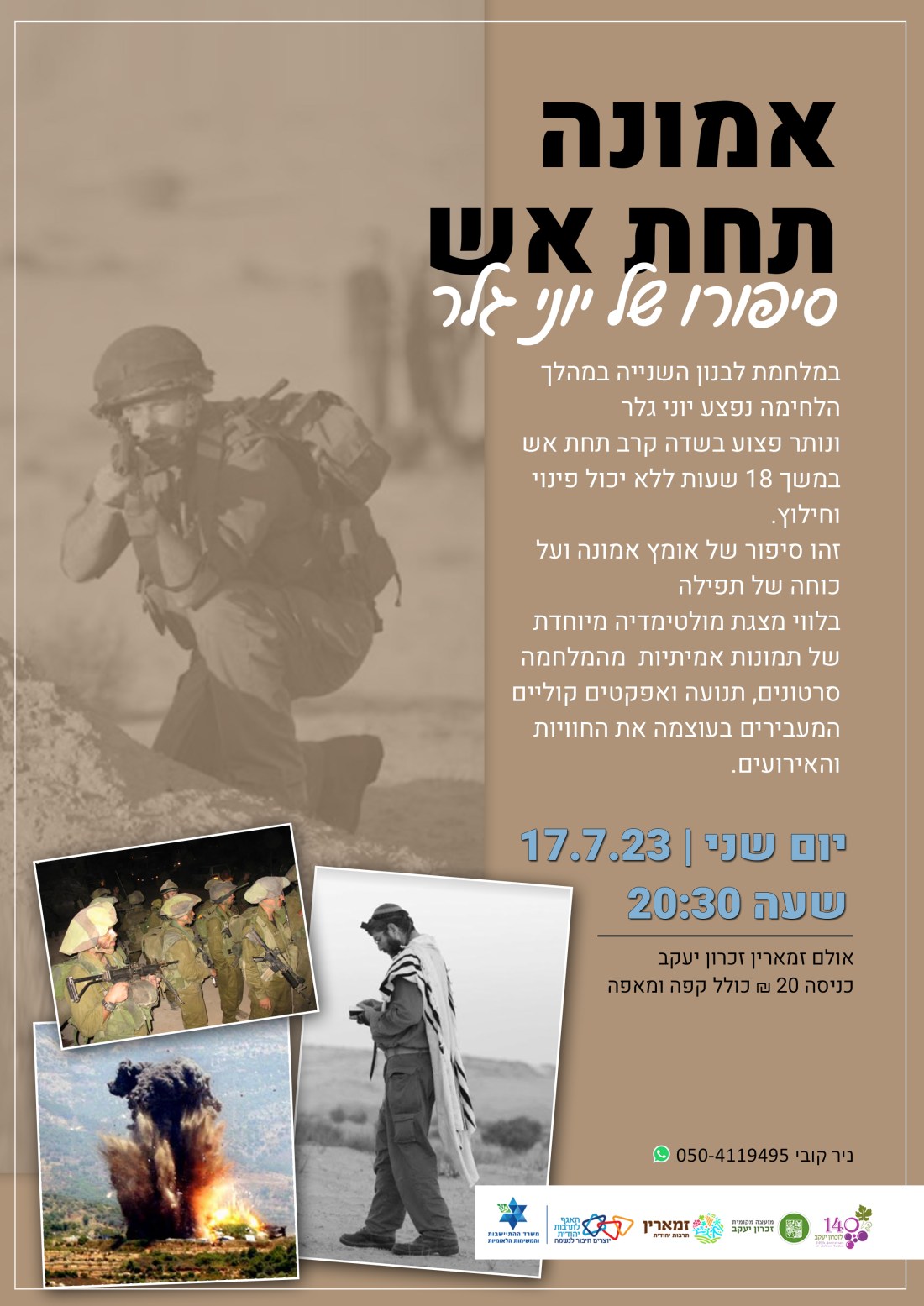 אמונה תחת אש – סיפורו של יוני גלר. במלחמת לבנון השנייה במהלך הלחימה נפצע יוני גלר ונותר פצוע בשדה קרב תחת אש במשך 18 שעות ללא יכול פינוי וחילוץ. זהו סיפור של אומץ אמונה ועל כוחה של תפילה בלווי מצגת מולטימדיה מיוחדת של תמונות אמיתיות מהמלחמה סרטונים, תנועה ואפקטיים קוליים המעבירים בעוצמה את החוויות והאירועים, … המשך קריאת הפוסט אמונה תחת אש