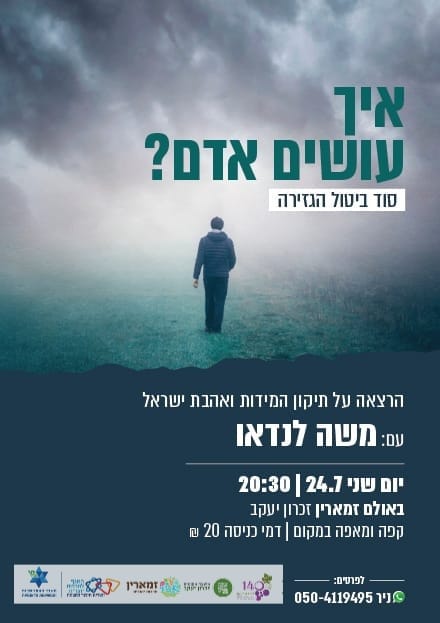 איך עושים אדם? - סוד ביטול הגזירה הרצאה על תיקון המידות ואהבת ישראל עם משה לנדאו יום שני 24.7.23 שעה 20:30 כניסה 20 ₪ קפה ומאפה במקום האירוע יתקיים באולם זמארין זכרון יעקב ניר קובי 050-4119495